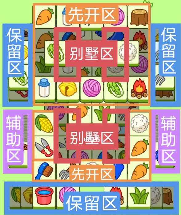 两个工字型大别墅组成,开局先消除橙色区,然后按照一层层均匀消除表面牌,哪里压牌比较多就先消除哪里,必要时可以用盲盒区辅助消除表面牌。尽量还是以别墅区内互相消除为主,蓝色区有叠牌,但是不多,全部保留到后期使用。