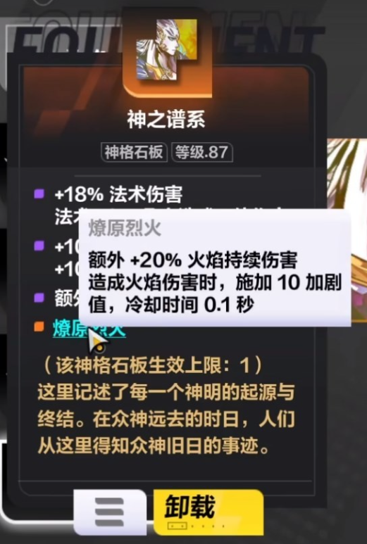 神格石板中,需要一块带有燎原烈火词条的神之谱系,可以造成额外的20%火焰伤害,造成火焰伤害时能够施加10加剧值。
