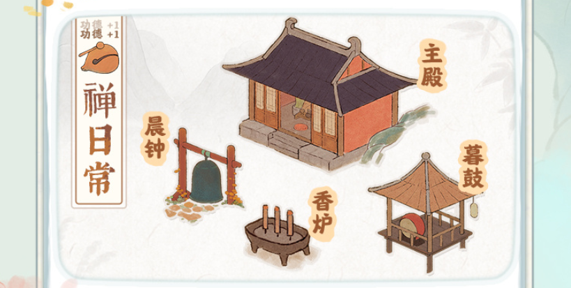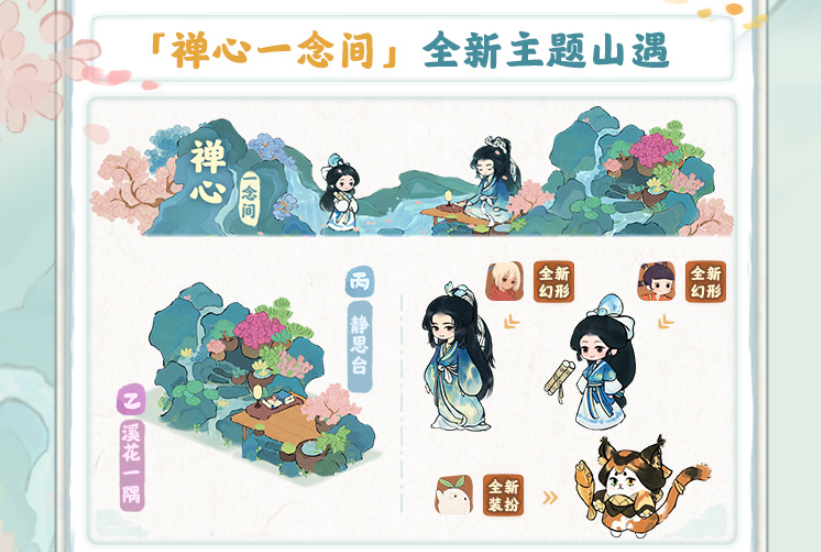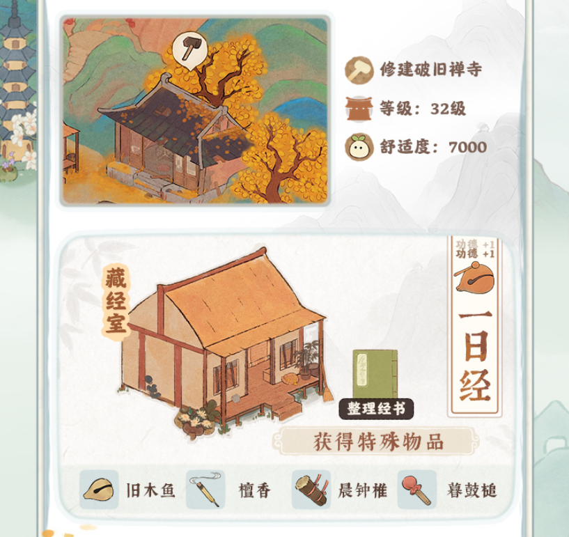 山民们可以在「禅意归心」限时创物池中获得以上建筑,装扮自己的萝萝山。