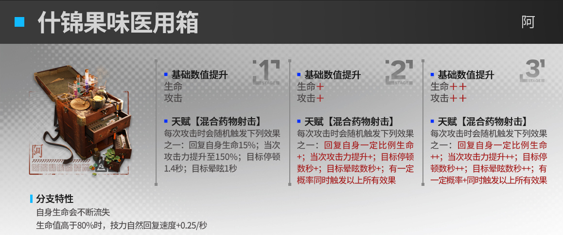 升级效果:在场停留20秒之后,自身弹药类技能上限比3还要高,其他随机一名拉特兰干员的弹药类技能弹药上限+1