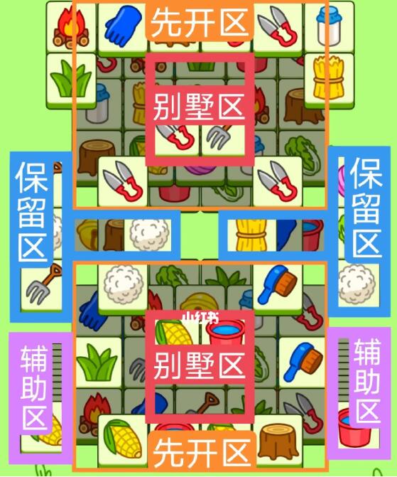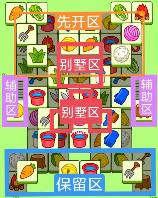 一个方形大别墅,一个V字型大别墅,开局先消除橙色区,这里压牌比较多。然后按照一层层均匀消除表面牌,不要跨层太多拿牌,必要时可以用盲盒区辅助消除表面牌。尽量还是以别墅区内互相消除为主,蓝色区基本都是明牌,全部保留到后期使用。