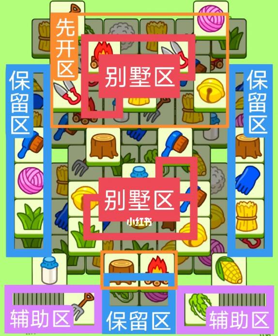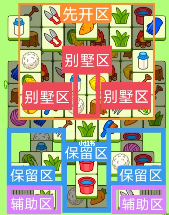 一个工字型大别墅,两个横着的长形别墅,可以用缝隙看牌法探底牌。开局先消除橙色区,然后按照一层层均匀消除表面牌。不要跨层太多拿牌,必要时可以用盲盒区辅助消除表面牌。尽量还是以别墅区内互相消除为主,蓝色区有叠牌。但是不多,全部保留到后期使用,优先使用中间部分蓝色区。