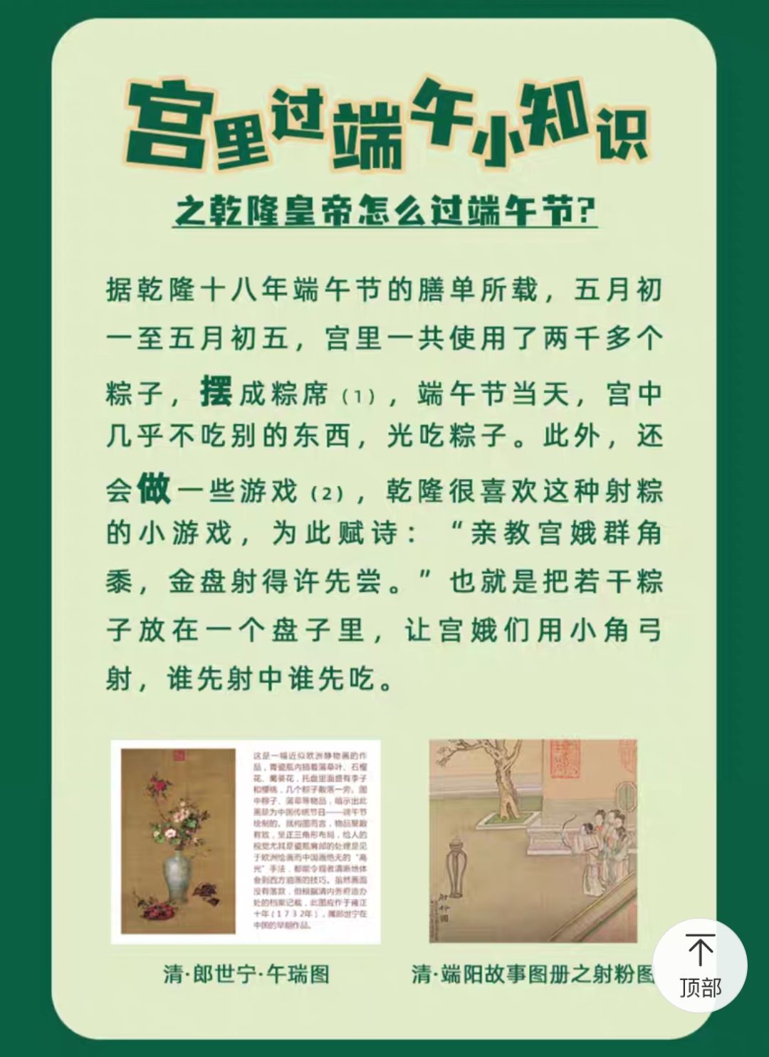 乾隆在端午如何吃粽子答案已经分享在上面,感兴趣的小伙伴可以参考本篇攻略,希望能为各位玩家们带来帮助,想要了解更多游戏攻略及资讯请持续关注多特游戏。以上就是手游巴士为您提供《淘宝每日一猜6月11日答案是什么 乾隆在端午如何吃粽子答案》的详细内容,更多精彩内容请继续阅读上一篇《鬼灭之刃锻刀村篇第十集在线观看 鬼灭之刃锻刀村篇第10集免费观看》2023-06-11 奇迹暖暖端午节有什么福利 奇迹暖暖江湖行端午节套装介绍