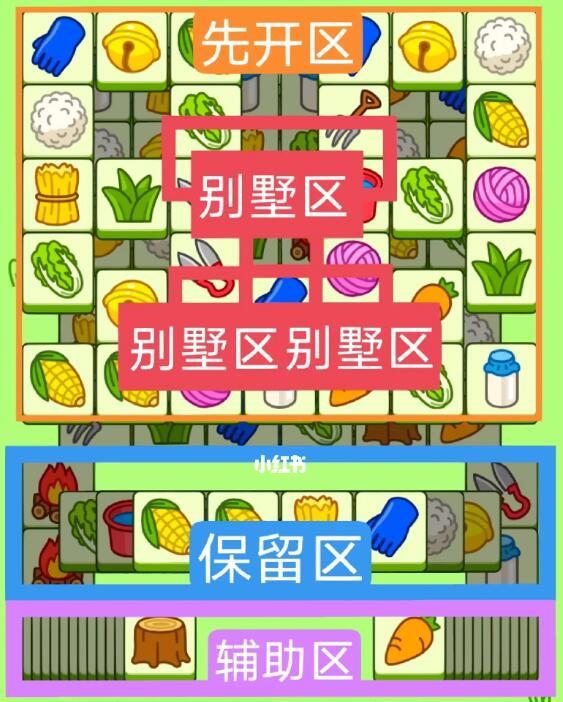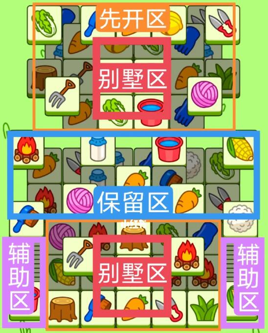 两个方形大别墅,开局先消除橙色区。然后按照一层层均匀消除表面牌。哪里压牌比较多就先消除哪里,必要时可以用盲盒区辅助消除表面牌,尽量还是以别墅区内互相消除为主,蓝色区基本都是明牌,全部保留到后期使用。