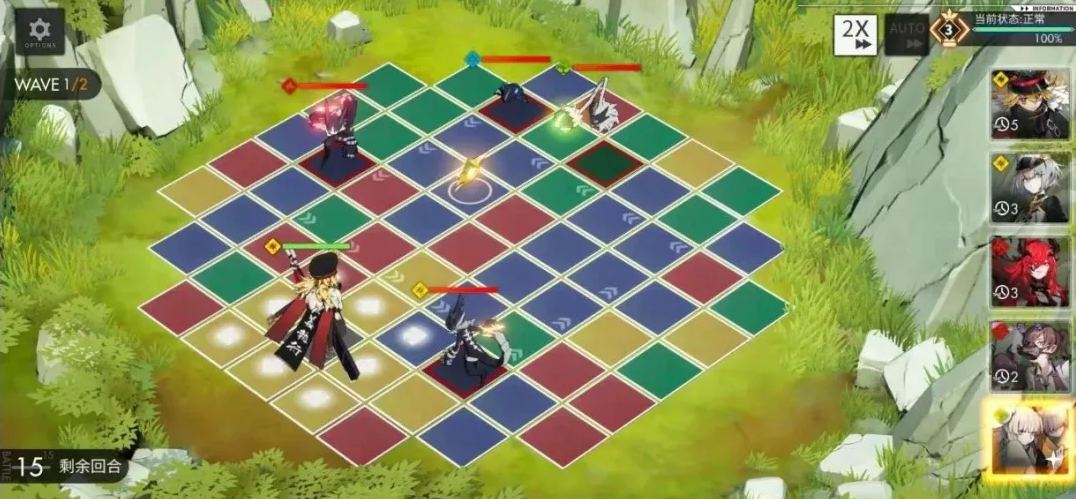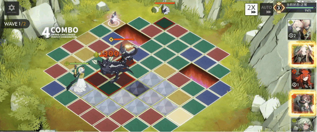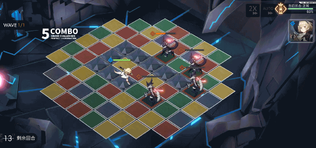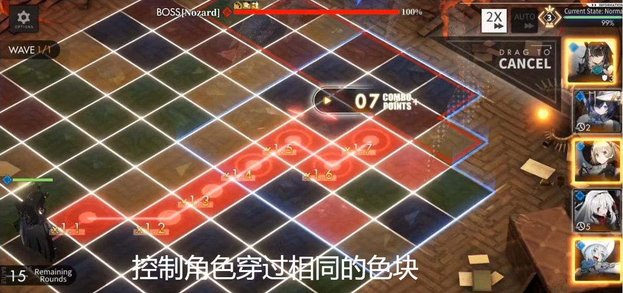 通过控制谱面上的角色通过相同的色块,角色可选择的前进方向是周围八个格子中的任意一个格子,当你通过的色块附近有敌方单位时,和格子底色相同属性的角色将对于敌人造成格子倍率*白字的伤害。 同时队长可以豁免格子底色判定,是否同属性都将对于敌人造成伤害。