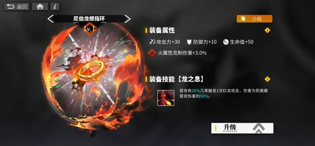 角色在觉醒后还可以解锁装备系统。装备相当于一个天赋或者Buff,需要单独进行升级,可以提升角色的数值;装备自带技能,这个不能主动释放,而是根据战斗的时机进行有条件触发,侧面提升角色的综合战斗力。