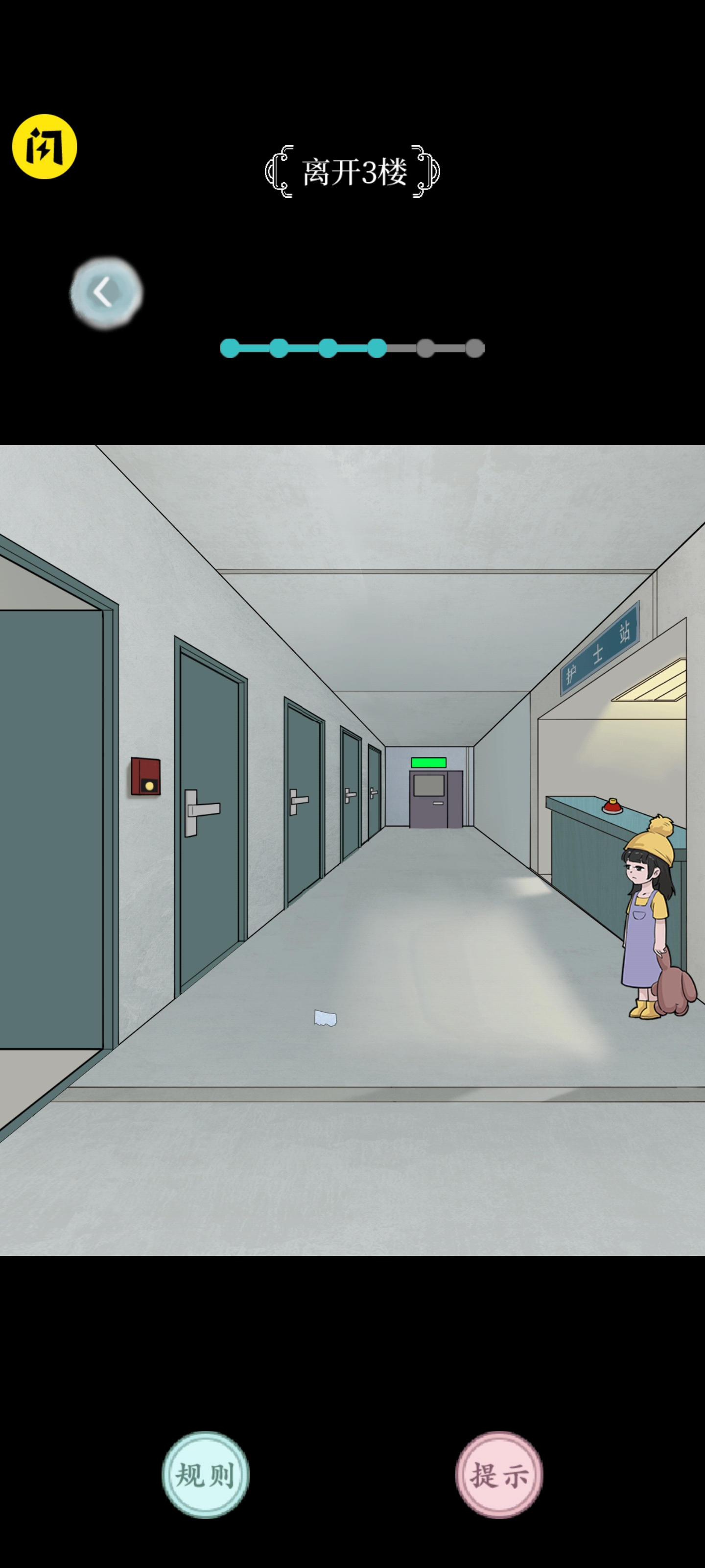 滑动画面进入电梯,点击2楼,点击病床上的纸条,关掉右边的电闸,进入住院部。