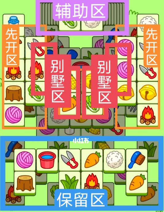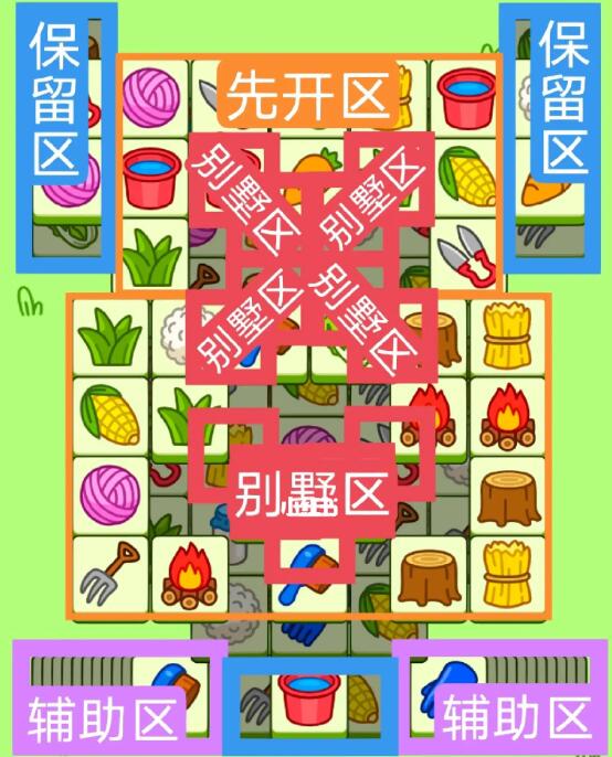 两个2+2+2叠牌大别墅。开局先消除橙色区,这里的压牌比较多,然后按照一层层均匀消除表面牌。不要跨层太多拿牌,必要时可以用盲盒区辅助消除表面牌。尽量还是以别墅区内互相消除为主,蓝色区基本都是明牌,全部保留到后期使用。