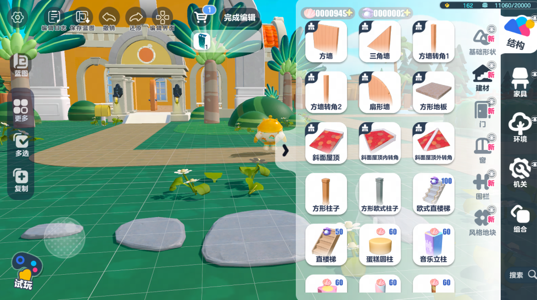 共有结构、家具、环境、机关、组合五种设施类型,上百种组件任蛋挑选。