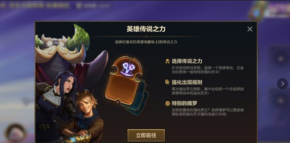 有了英雄传说之力,你就能在战局开始前,对自己拿到的强化符文施加一些影响!从15种独特的英雄传说之力中选择一个,每种都代表着不同的玩法风格。在对局前装备最喜欢的英雄传说之力,就像配置最喜欢的小小英雄、棋盘或进攻特效一样。好了,我们来仔细谈谈吧!