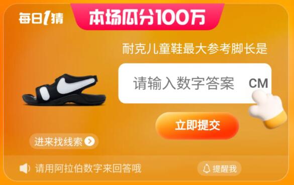 耐克儿童鞋最大参考脚长是已经分享在上面,感兴趣的小伙伴可以参考本篇攻略,希望能为各位玩家们带来帮助,想要了解更多游戏攻略及资讯请持续关注多特游戏。以上就是手游巴士为您提供《耐克儿童鞋最大参考脚长是 淘宝每日一猜答案6.17》的详细内容,更多精彩内容请继续阅读上一篇《淘宝每日一猜6月17日答案 耐克儿童鞋最大参考脚长》2023-06-17 第五人格咒术师椰香假日怎么样 第五人格咒术师椰香假日三视图