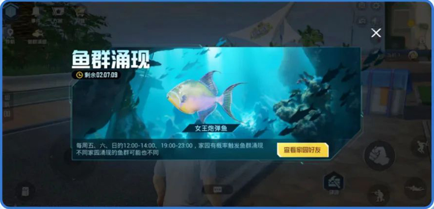 每周五、六、日的12:00-14:00、19:00-23:00家园将有一定概率触发鱼群涌现,并且不同好友的家园涌现的鱼群可能也不同。
