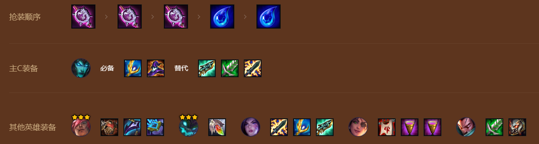 前期装备先给前排装,搭配两主宰四挑战三艾欧能平稳发育。