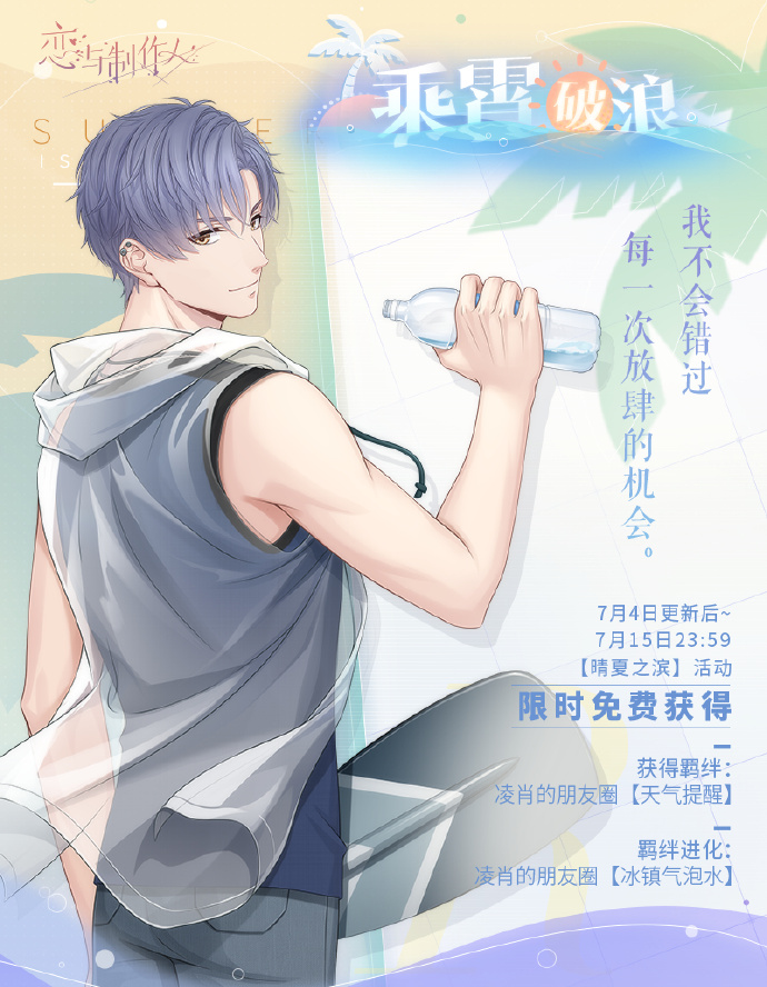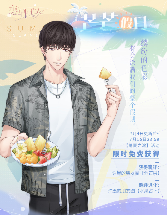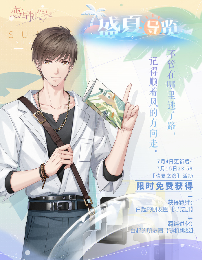 2. 完成对应角色的所有主线剧情后,即可在【小岛蓝图】中领取海岛夏日纪念R羁绊【周棋洛·椰趣无穷】、【白起·盛夏导览】、【许墨·芒芒假日】、【李泽言·筑沙时光】、【凌肖·乘霄破浪】!