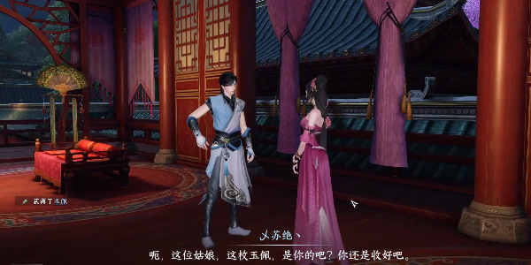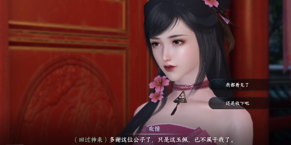 2、随后捡起屋中的玉佩并且交给欢情,在对话中选择【还是收下吧】。