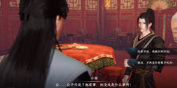 4、再次找到欢情进行对话,随后就有小厮前来挑事,对话选择【你若不说,我就打到你说】。