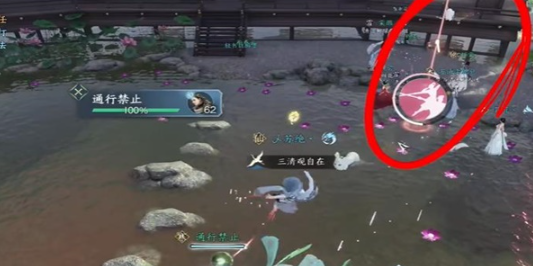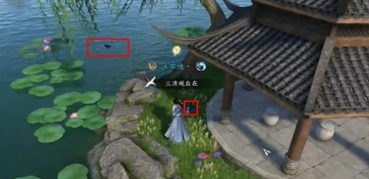 3、接着我们就可以发现到莲叶下似乎藏着一件东西,接着我们就蹲下查看到上面有字。