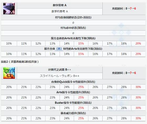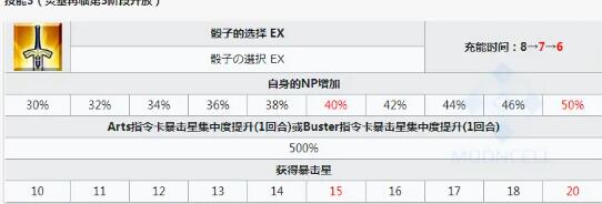 3t2次回避 3t必中 敌方全体降3t20蓝耐 恶属性再降3t20蓝耐 一个保命加弱化的一个技能 这个必中和回避 我希望以后强化本改成无敌和无敌贯通毕竟是五星限定 降蓝耐相当于变相蓝放 提高蓝卡性能的 可以配合蓝卡打伤害和强化宝具np回收 也可以通过宝具赋予恶属性再使用来达到收益最大化