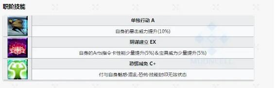 10暴伤 5蓝放5宝具威力提升 自身魅惑·混乱·恐怖·技能封印无效 前两个比较普通 后面的弱体无效就很离谱 不仅三个免疫异常全是控制类的 而且还免疫技能封印 可以说是相当实用的被动了