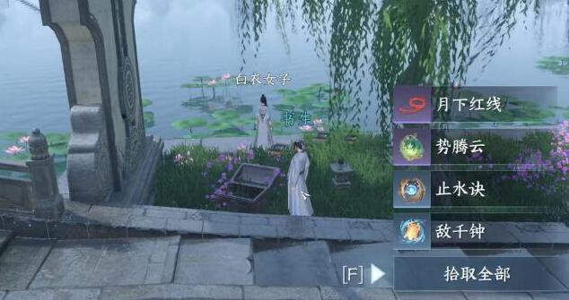 5、最后根据剧情在桥边上找到白衣女子,对话捡起宝箱就能获得月下红线。