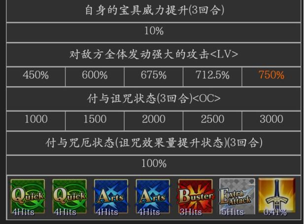遮蔽暗夜的月之宝珠 提升自身宝具威力3回合,付与敌方全体诅咒,赋予全体敌人呪厄状态(诅咒效果增加)(3回合)。