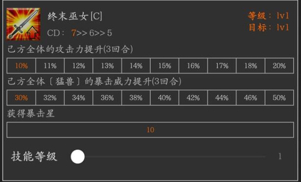 三技能 终末巫女 提升己方全体攻击力10-20,己方全体【猛兽】暴击威力提升30-50,获得10个暴击星。