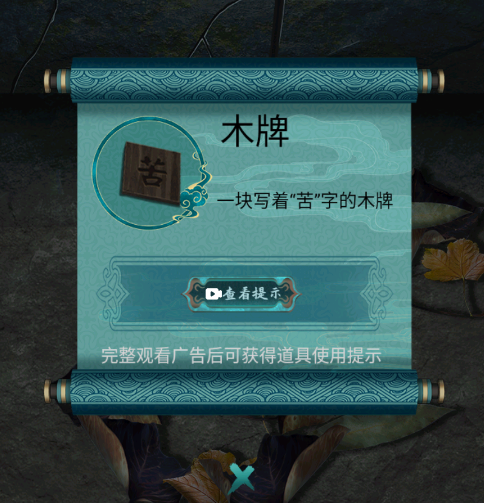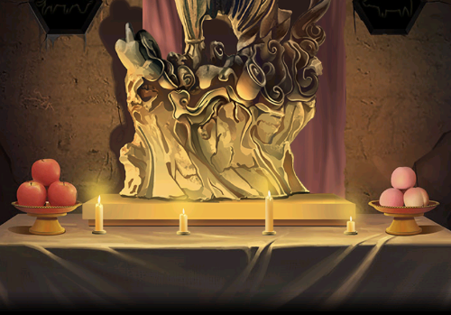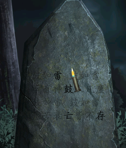 3、根据右侧墙上的文字,了解庙前的石头需要使用火。将蜡烛放到石头上,获得大门的密码:雷、鼓、亡、存。