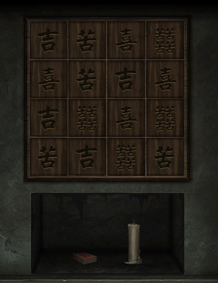 2、将牌子放进左侧墙上的机关,完成翻牌小游戏,获得火柴,用火柴点燃蜡烛,获得点燃的蜡烛。