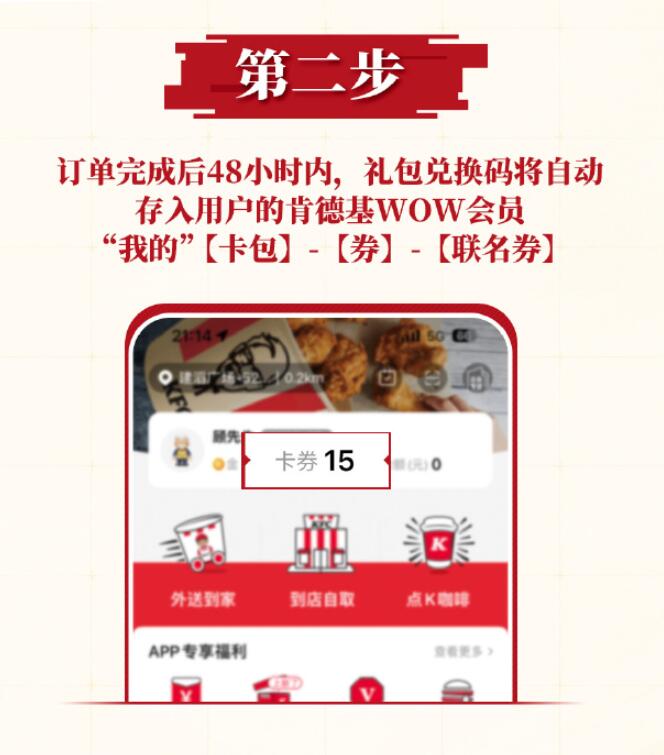 订单完成后(外送订单送达后)48小时内,礼包兑换码将自动存入用户的肯德基WOW会员