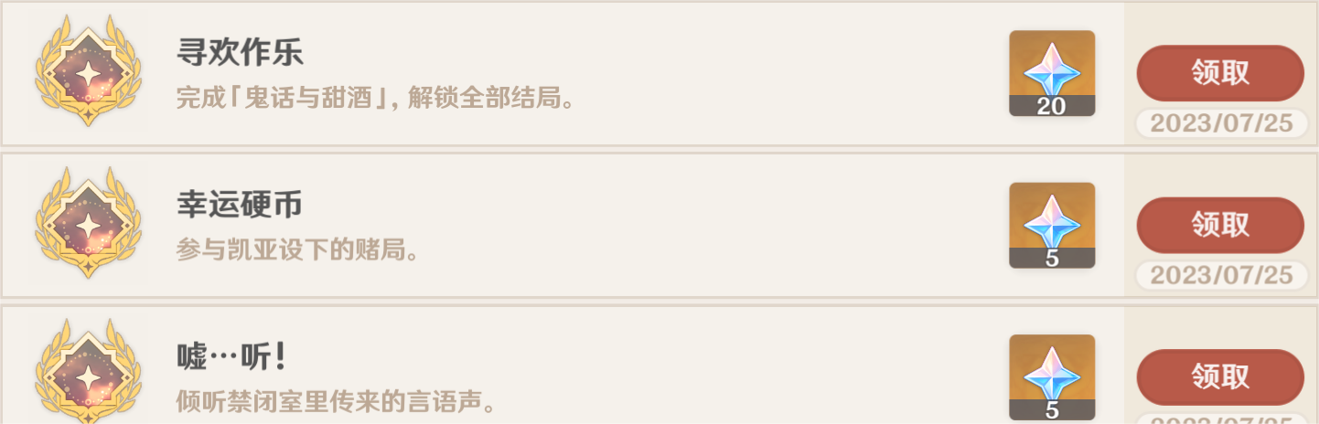 完成凯亚邀约事件第一幕「鬼话与甜酒」中的全部5个结局,即可获得该成就。