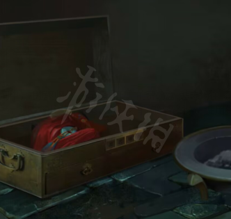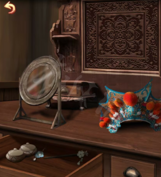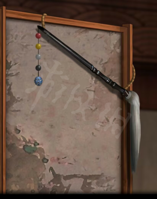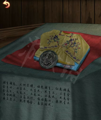 16. 回到二楼房间,将之前获得脸谱挂件全部放入盒子内,根据拂尘上的颜色顺序摆放,依次为 红黄白黑 ,打开获得铜剪