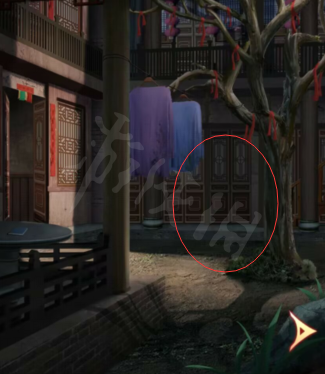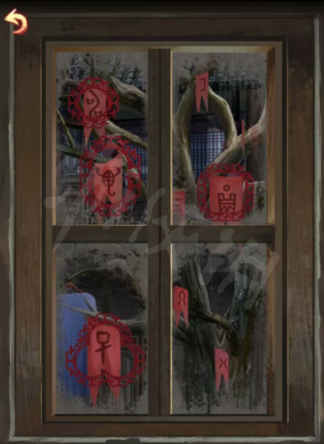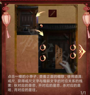 7. 回到一楼的初始场景调查深处的门,根据二楼灯笼的文字和石桌上书的提示,如图解开锁进入