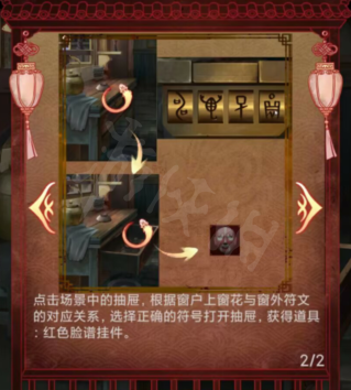 3. 调查窗户关上窗,获得解谜提示,解开窗户下方抽屉的锁,获得红脸谱挂件