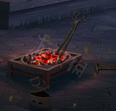 8. 来到室外,右边的钳子用羊角锤装好,将煤块放到烫斗中,获得铁烫斗,火盆旁获得木炭