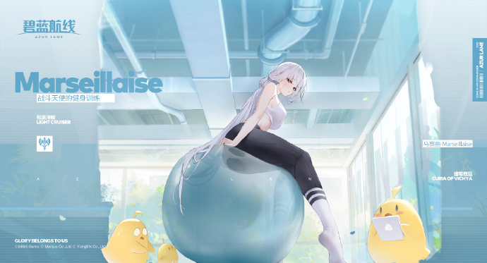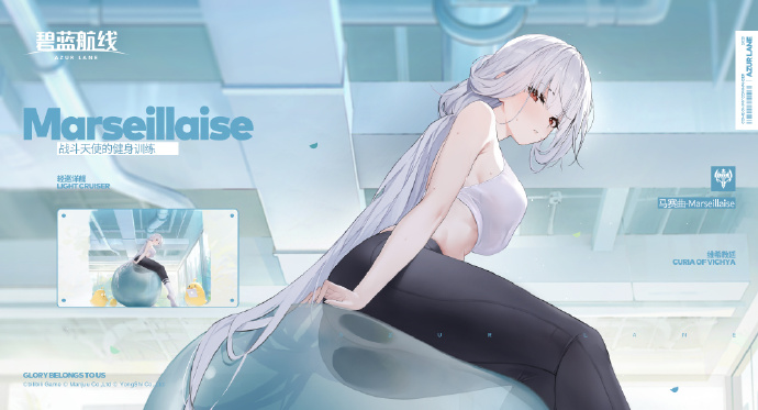 立绘设计上很不错,就喜欢这种特别显身材的健身服,特别的贴身,而且还是黑色的紧身裤配合白袜的搭配,而这里透明的健身球也很懂人心的映出了马赛曲的身材,不得不说官方画师还是太懂了,太会玩各种花样了。