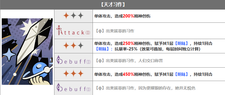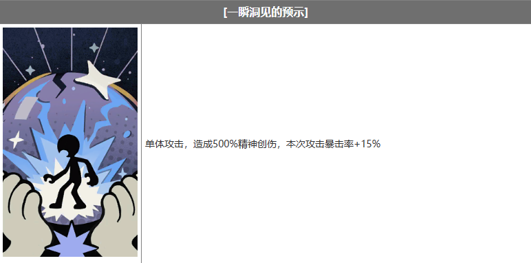 单体攻击,造成500%精神创伤,本次攻击暴击率+15%