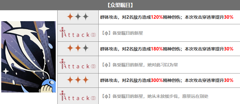 群体攻击,对2名敌方造成120%精神创伤;本次攻击穿透率提升30%