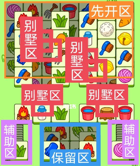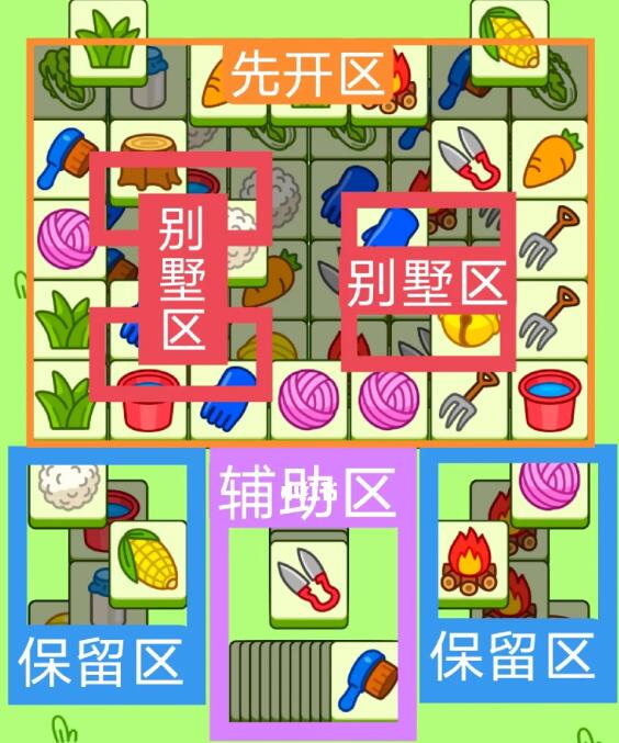 一个工字型大别墅,一个方形大别墅,开局先消除橙色区,然后按照一层层均匀消除表面牌,哪里压牌比较多就先消除哪里,必要时可以用盲盒区辅助消除表面牌,尽量还是以别墅区内互相消除为主,蓝色区有叠牌,但是不多全部保留到后期使用。