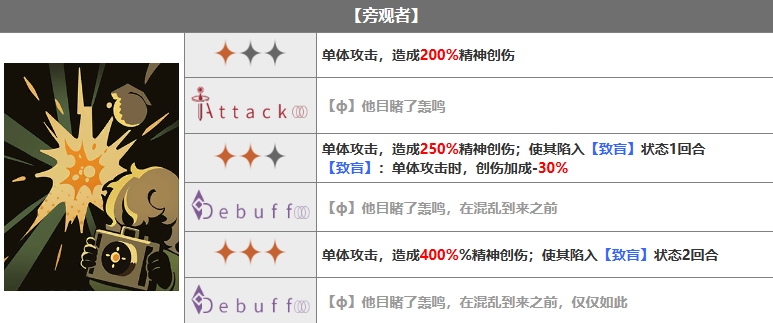 群体攻击,造成300%精神创伤;其他友方获得1回合【隐现】【隐现】:被现实创伤攻击时,受创减免+50%