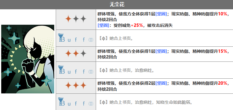 群体增强,使我方全体获得1层[坚固];现实防御、精神防御提升10%,持续2回合