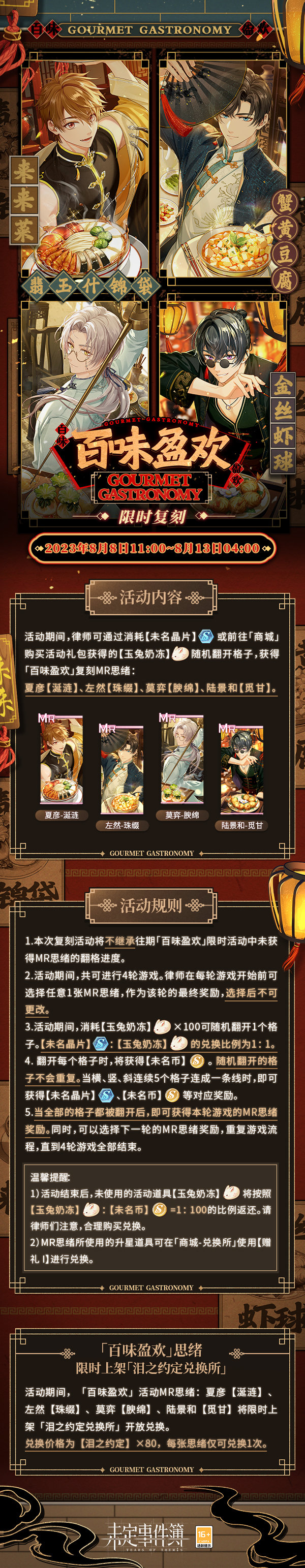 活动期间,「百味盈欢」活动MR思绪:夏彦【涎涟】、左然【珠缀】、莫弈【腴绵】、陆景和【觅甘】将限时上架「泪之约定兑换所」开放兑换。兑换价格为【泪之约定】×80,每张思绪仅可兑换1次