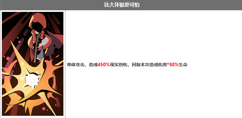 单体攻击,造成450%现实创伤,回复本次造成伤害*50%生命
