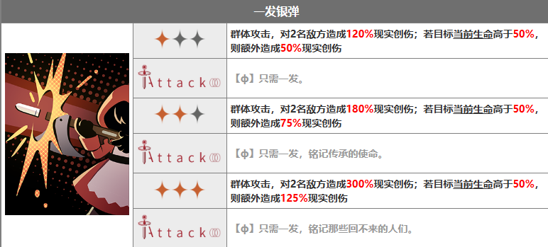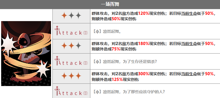 群体攻击,对2名敌方造成120%现实创伤;若目标当前生命低于50%,则额外造成50%现实创伤
