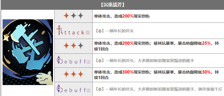 单体攻击,驱散目标[属性提升][状态增益][反制],造成450%现实创伤,额外使目标陷入 [缴械]1回合
