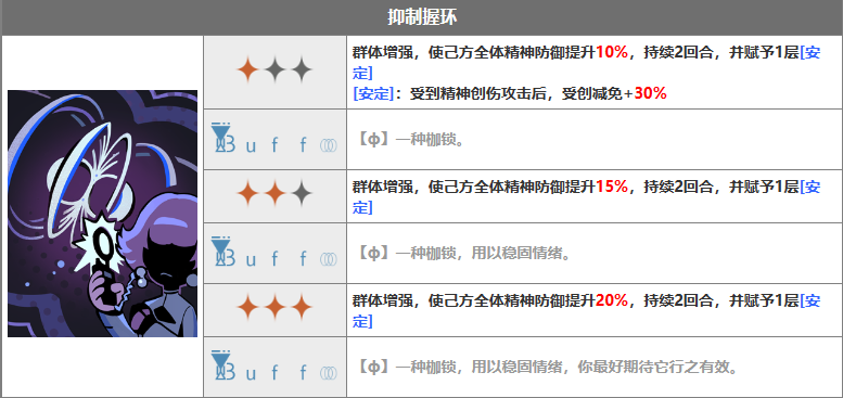 群体增强,使己方全体精神防御提升10%,持续2回合,并赋予1层[安定]