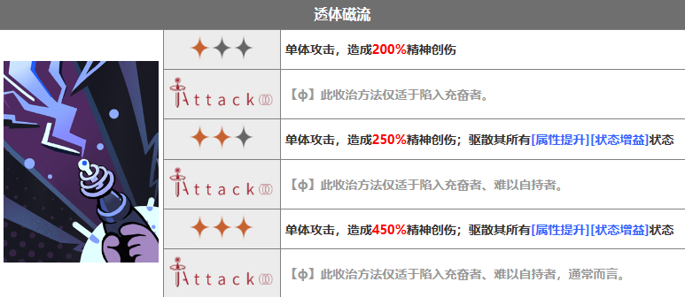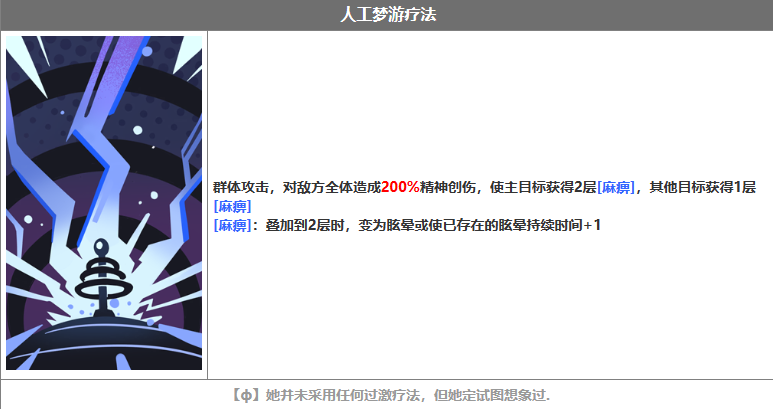 群体攻击,对敌方全体造成200%精神创伤,使主目标获得2层[麻痹],其他目标获得1层 [麻痹]