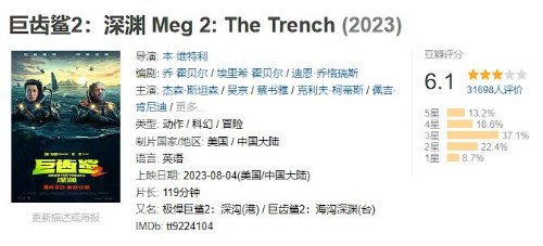 在烂番茄方面,《巨齿鲨2》的新鲜指数只有28%,而其爆米花指数也只有69%。这意味着,很多英语国家的影迷认为,这部电影的“爆米花程度”也并不高。