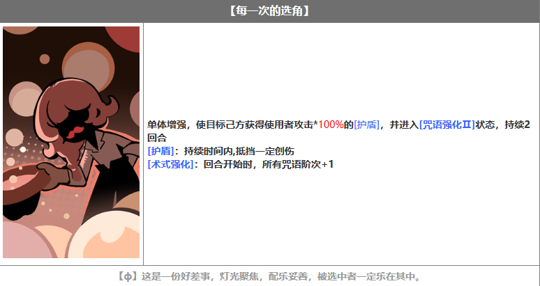 单体增强,使目标己方获得使用者攻击*100%的[护盾],并进入[咒语强化Ⅱ]状态,持续2回合