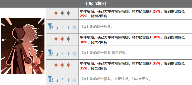 单体增强,使己方单体现实防御、精神防御提升25%,受到伤害降低 25%,持续2回合