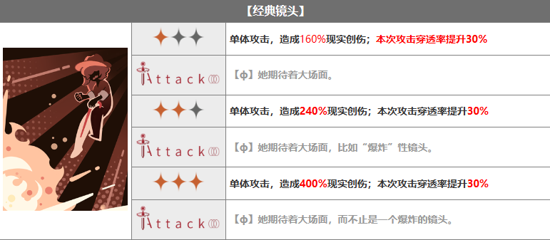 单体攻击,造成160%现实创伤;本次攻击穿透率提升30%